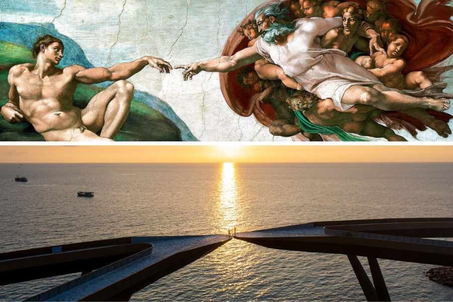 Lấy cảm hứng từ bức tranh “Chúa tạo ra Adam” của Michelangelo – kiệt tác mô tả thời khắc thiêng liêng khi Đức Chúa chạm ngón tay vào Adam để trao nguồn sống, Cầu Hôn Phú Quốc gây ấn tượng mạnh mẽ bởi thiết kế bỏ ngỏ một khoảng 30cm và chỉ được nối liền bằng một nụ hôn lãng mạn, một cái ôm nồng thắm hoặc một cái bắt tay đong đầy tình thân ái.