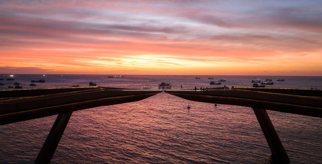 Tọa lạc tại hướng chính Tây của đảo Phú Quốc – hòn đảo được đánh giá là nơi đón hoàng hôn đẹp nhất Việt Nam, Cầu Hôn Phú Quốc là địa điểm ngắm trọn vẹn khoảnh khắc hoàng hôn trên biển, chiêm ngưỡng không gian giao thoa giữa trời và biển với 4 sắc độ màu độc đáo: vàng, cam, hồng và tím.
